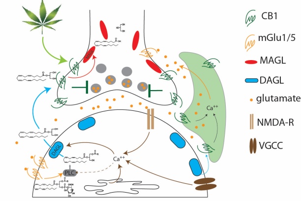 (Above) Synthetic pathway for 2-AG in neurons. 2-AG is produced by diacylglycerol lipase (DAGL) expressed in dendrites of principle neurons. This enzyme converts diacylglycerols into monoacylglycerols including 2-AG. Once formed, 2-AG can activate CB1 receptors, or be degraded by monoacylglycerol lipase (MAGL). In addition, 2-AG is a substrate for COX-2.